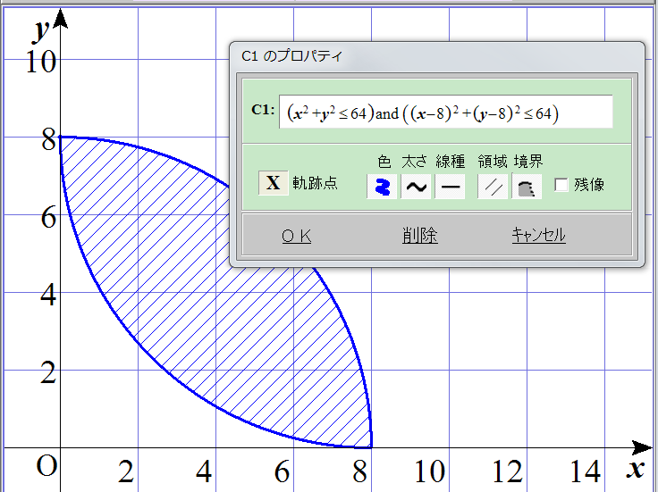 (x^2+y^2<=64) and ((x-8)^2+(y-8)^2<=64)