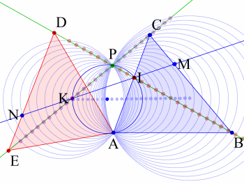 △ADEが点Aの周りを回転するとき,これら交点の軌跡が円であることは当然ですが,ここでは,三角形を回転させずに,辺上の対応する点M,Nだけを動かします。すなわち (1) の関係を保ちながら比の値だけを変化させます。このとき,不思議なことに△PKIの外接円は点P以外にも定点を通るのです。